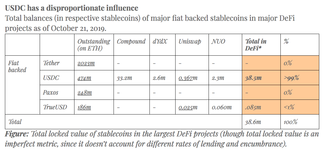 All other fiat backed stablecoins have negligible usage in DeFi. But so what, you might say—this is a problem that the market can solve. Let other stablecoins like Tether and TUSD, which have billions in circulation, step up and take USDC’s place.